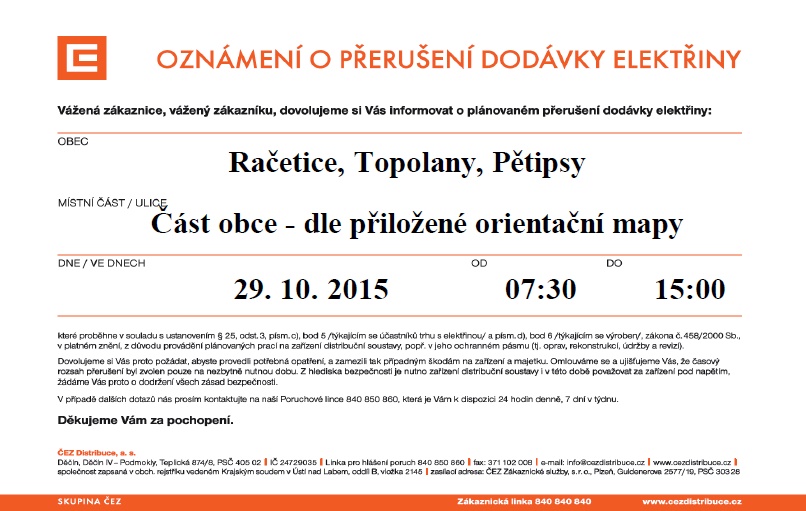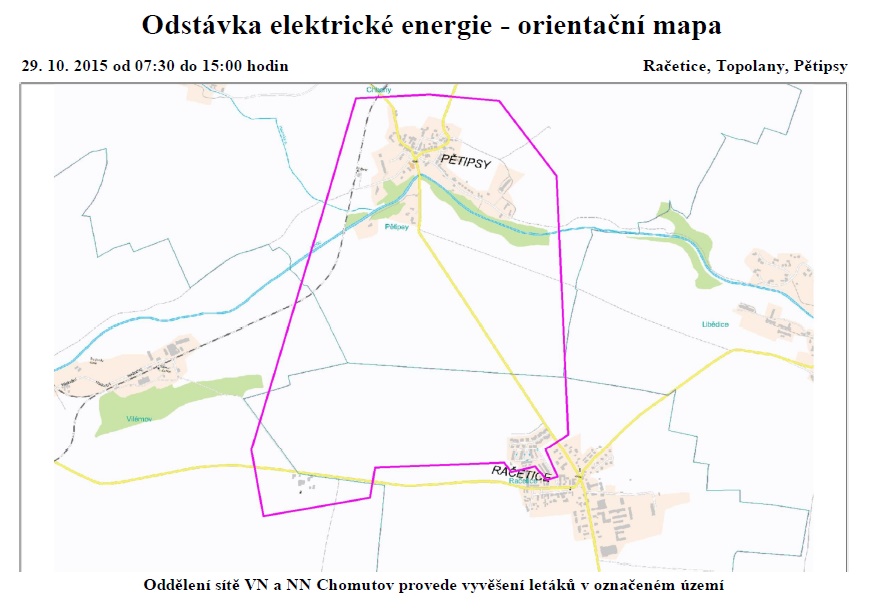 Dne 29.10.2015 od 7:30 do 15:00 bude přerušena dodávka elektřiny v části obce Račetice, dle přiložené mapy.